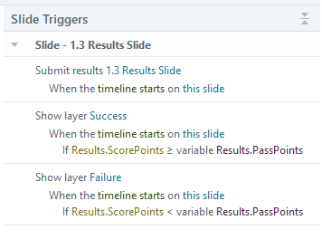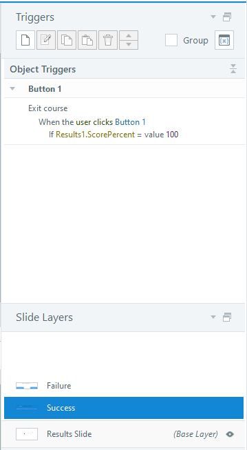 And here is my Success layer: You can see that in this layer the results must be 100% before they can exit. If not, they can't even reach this layer. I will try your method with the save score and continue (to an exit slide) like you suggested and see if that does the trick.