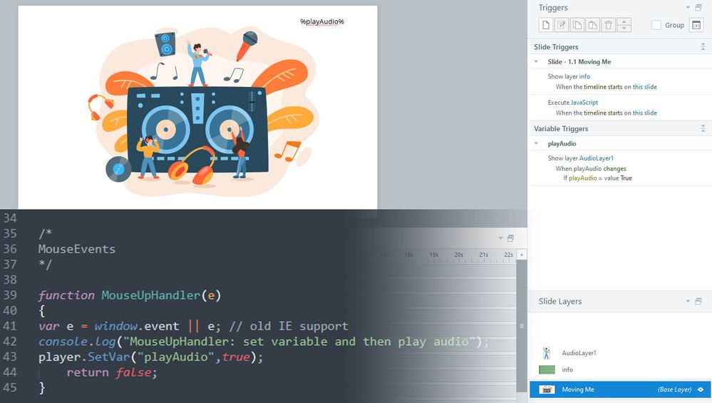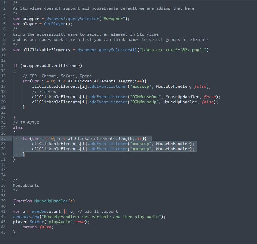 So in the Javascript code we now can select all our elements. In the MouseUpHandler i just set the variable 'playAudio' in Storyline.