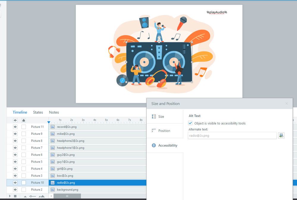 In the sample i made i exported all images from Illustrator at double scale. So they get named 'image@2x.png'. This makes it easy for me to select all images with a selector. If you have an existing Storyline where you donot have a proper naming of your assets so you can select all easily... you need to set 'accessibility names' directly in Storyline.