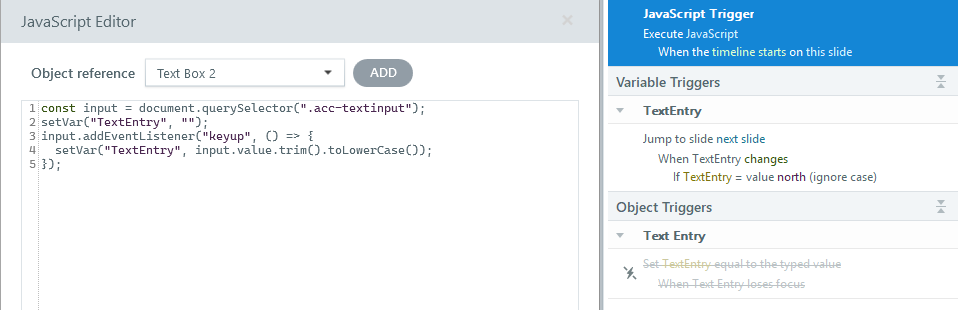 const input = document.querySelector(".acc-textinput"); setVar("TextEntry", ""); input.addEventListener("keyup", () => { setVar("TextEntry", input.value.trim().toLowerCase()); });