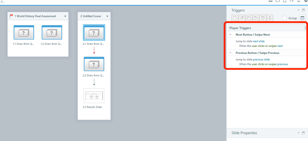 Is there a way to retrieve these triggers? I'm a newbie and am taking an asynchronous course to learn 360. I'm creating an assessment. It has two question banks and draws established for each bank. I have also created a results slide. In a preview, the quiz goes perfectly but it will not go the results slide. I think I know why but want to know if there is a fix for it or if I'm doomed, lol.