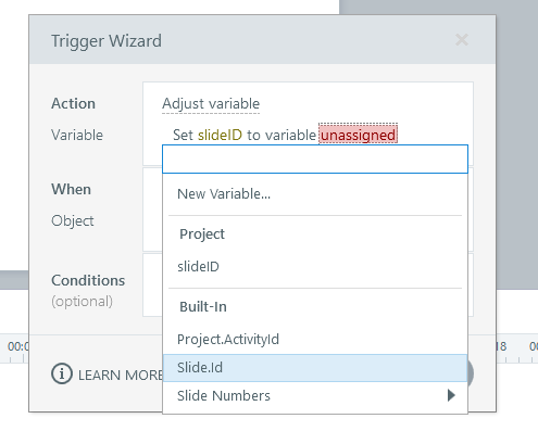 The built-in variable for the slide ID is "Slide.Id" that returns NULL. I have tried other built-in variables and all return NULL.