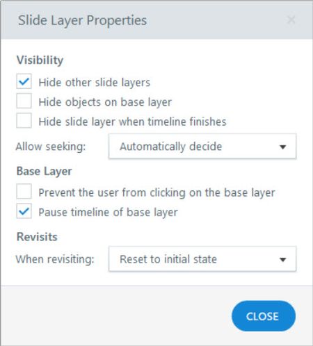 On my base layer, I have 4 steps buttons. Each has its own layer. On each step layer, there is a video or an image with a button on the image or video to expand it, which is also on its own layer. T...