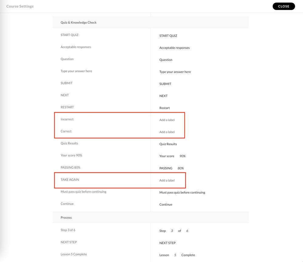 Hi Andrew! To edit the "TAKE AGAIN" or remove the Correct/Incorrect feedback, go to the Labels section under the Course Settings and scroll down to Quiz & Knowledge Check.