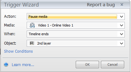 - Hi Ray, - No bother at all - that's what we're here for!   - You could set a trigger like the one I have below that pauses the media when the timeline ends. You could also set it to hide the layer when the timeline ends. Is that what you're looking for? If not, would you be able to share your .story file here with me so that I could look more specifically at how you'd like to set it up?