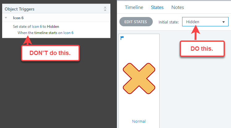 Also note that you don't need triggers to change the state of those X (close) icons to Hidden when the timeline starts. Instead, just set their initial state to Hidden.