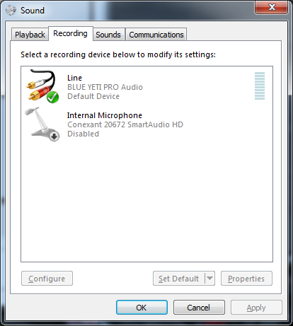 I've installed a Blue Yeti Pro USB mic and it was working at one point under the screen recording, sound recording, microphone and now it's back to just the internal mic. Any clues how to reassociate this USB mic under Windows 7 64-bit OS?