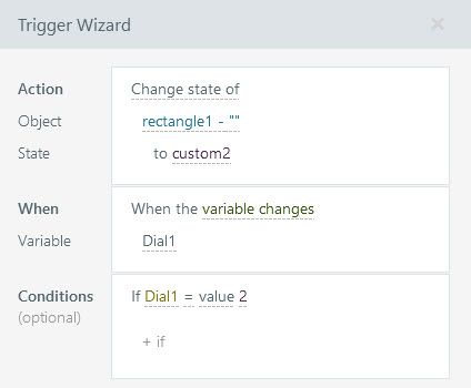 The value of a dial or slider variable is handy to use in triggers. For example, a trigger might change the state of an object with a condition based on the value of the dial. That would look something like this:
