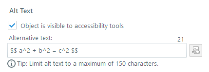Keep in mind that the sample equation above is very basic. In chemistry, engineering and other fields, equations can be incredibly complex. If Storyline allowed us to create the equation directly in the software and have the Alt-text auto-generated, wow, that would be a huge time saver for the developer and a great benefit to end users.