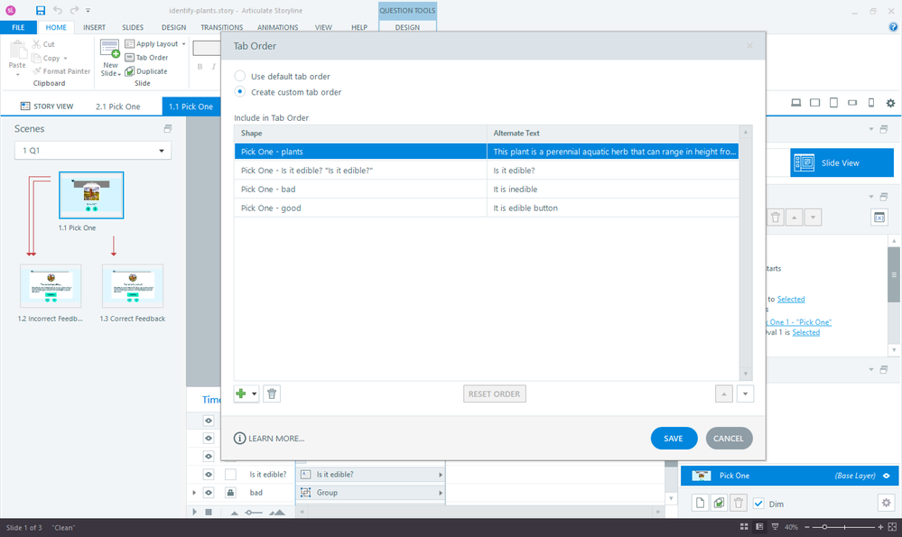 In terms of screen reader support, for now Articulate Storyline 360 supports JAWS (you can read more about screen reader support here: https://articulate.com/support/article/Combined-Tech-Specs-for-All-Articulate-360-Apps#screen-readers) Important to note, we are having the discussion about supporting a broader range of screen readers. Accessibility in general is very important to us and an area we're making ongoing improvements in.