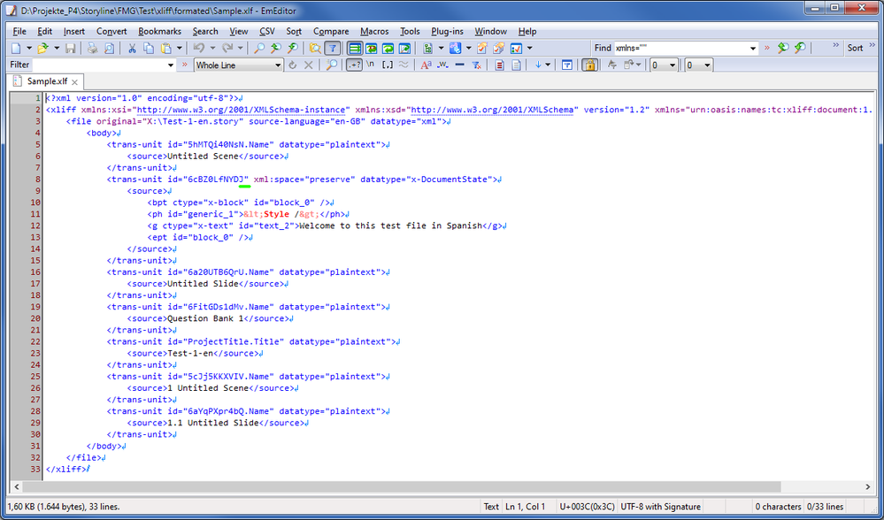 (1) storyline don't understand xmlns="" -> remove all entries from the translated xliff