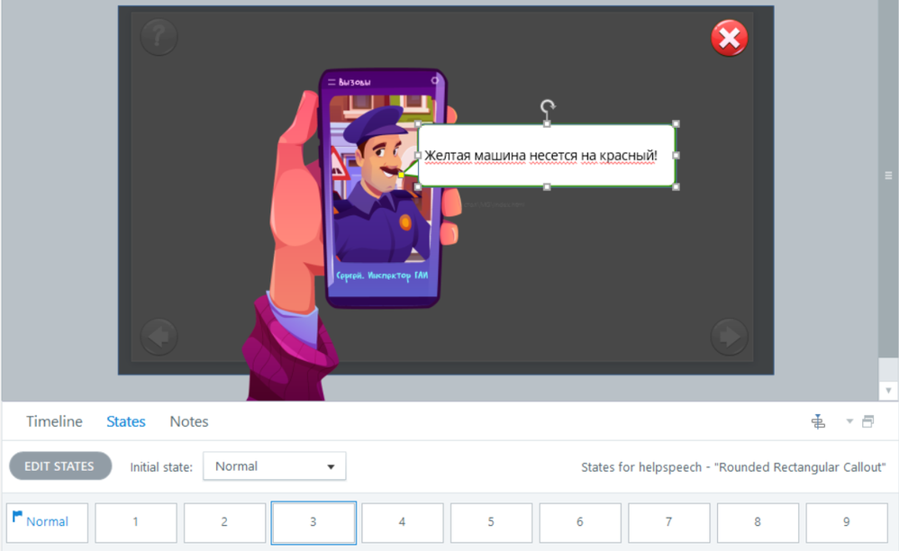 Let's create a speech bubble and add 9 states to it. We have 8 violations, so we'll have 1 state for each violation, and the last 9th state will be a hint to press the green arrow if you have found all violations.