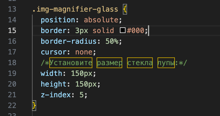 At the top of the code, we can adjust the styles of our magnifying glass, i.e., how it will look. Here, we can change the height and width of the magnifying glass.