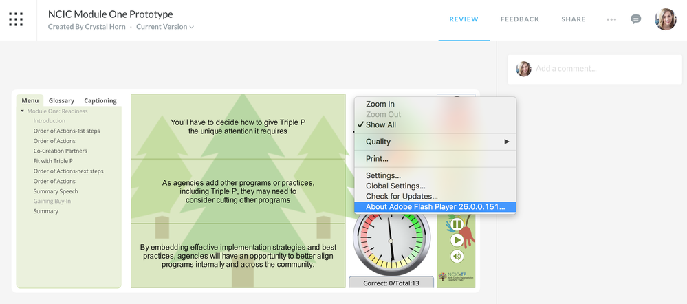 Hmm, since you don't see "About Adobe Flash Player", that tells me that you're likely viewing the HTML5 output.