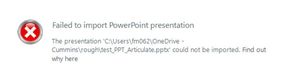 I am failing to import Powerpoint 365 slides into Storyline (from Articulate 360 1.42.22691.0) using a Windows 10 laptop.