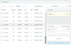 I imported 38 audio files into the Media library and then added the caption files for each. When I go to insert an audio file on a slide, the insert audio clip is greyed out. It works some ...
