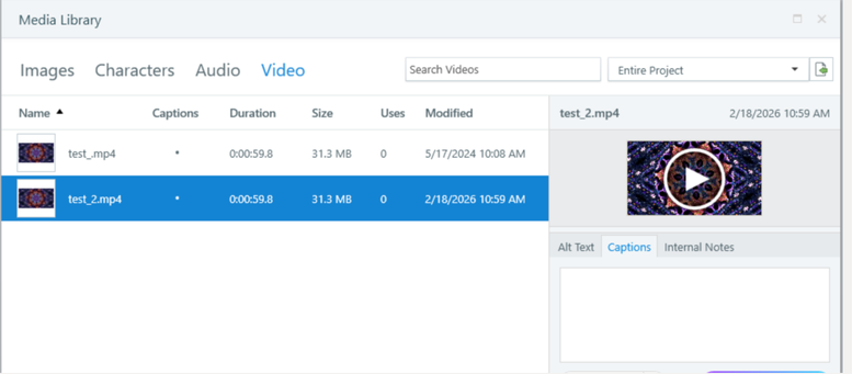 test_.mp4 is uploaded to media library, I then duplicate the source .mp4 and rename it to: test_2.mp4. I now have two files with identical properties, but two different file names. When I upload test_2.mp4, instead of uploading as it's own media, Storyline will replace test_.mp4 with test_2.mp4