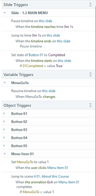 Hi, I have a main menu on my course with an exit animation. I am using the attached triggers for navigation when the menu items are clicked.