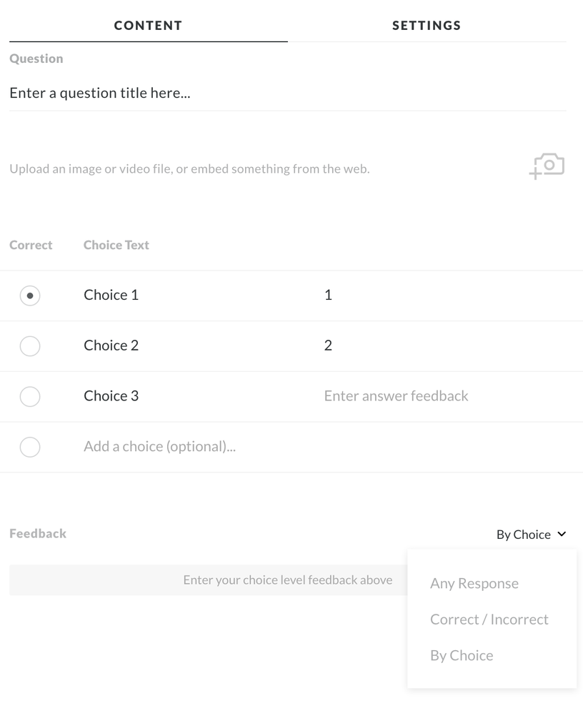 If you choose By Choice, you can type specific feedback on the side of each answer depending on the answer chosen. You can continue adding Answer Feedback as you add more choices.