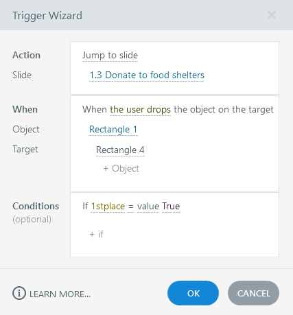 I'm trying to make a drag and drop activity where you'll be able to drag 6 statements into rankings and I want a certain slide to show depending on the statement in the 1st place ranking.
