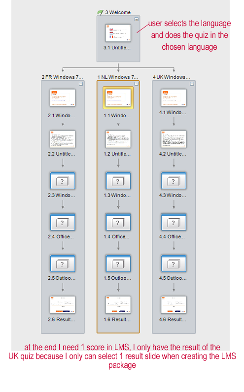 I need to combine these 3 projects in one, at the beginning the user chooses the language and at the end i need the score of 1 quiz in LMS. When creating the LMS package I only can select 1 result slide. When I click the review button on one of the result slides, I sometimes got the review of another language :(