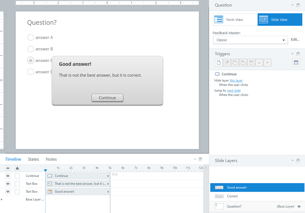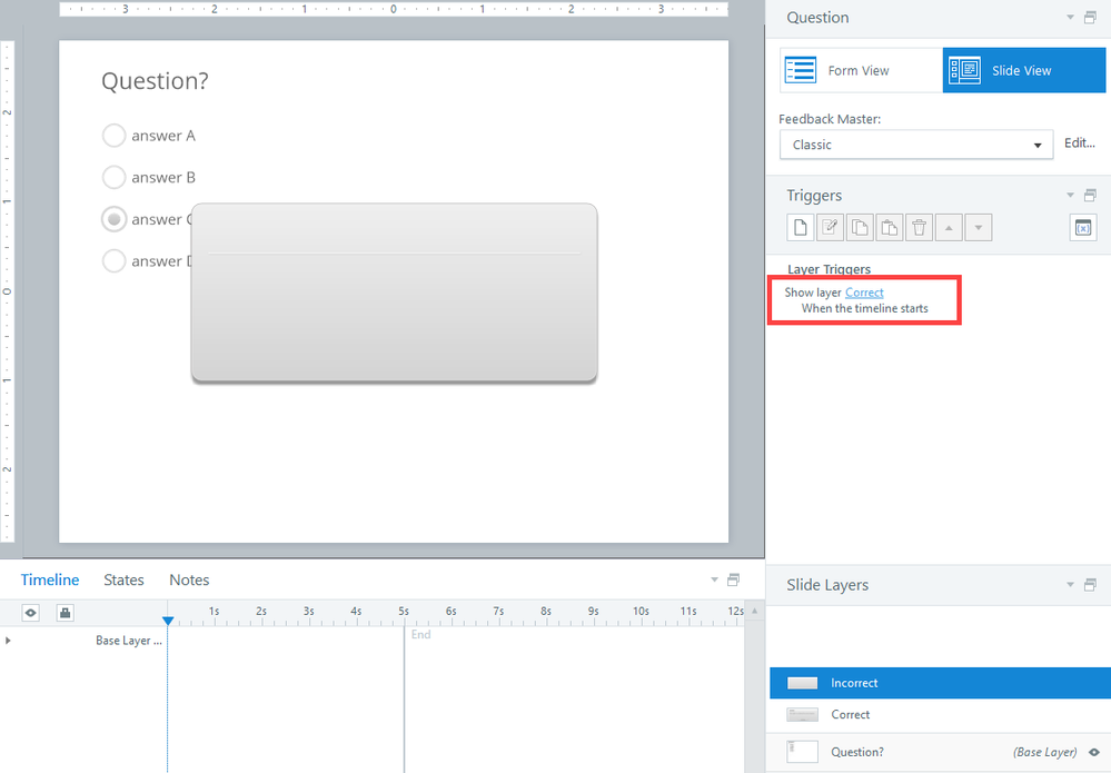 - To always show the Correct layer, do this: Delete all the text on the Incorrect layer. Delete the Continue button. Add a trigger to show the Correct layer when the timeline of the Incorrect layer starts. An example of this is shown in the image below: