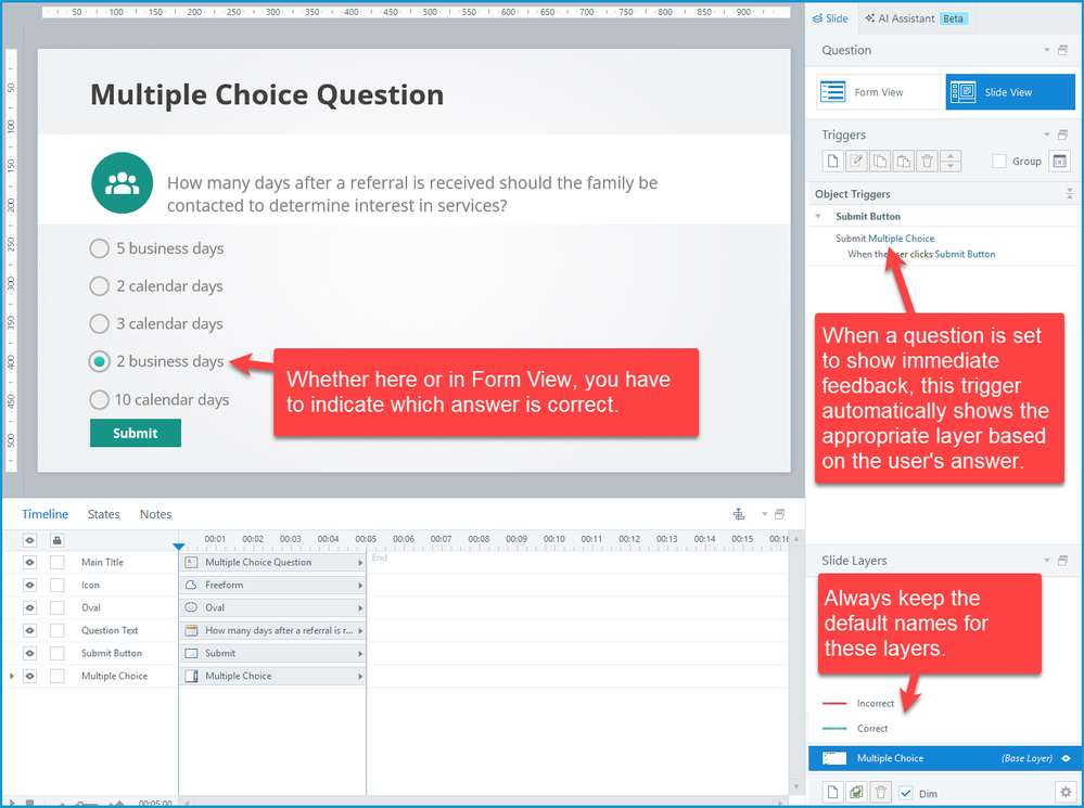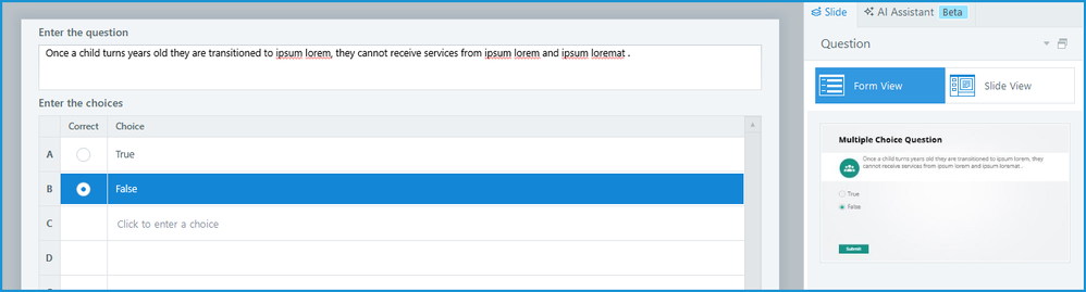 Also, you need to tell Storyline which answer is correct. That can be done by selecting the correct on the slide (as shown in the image above), or by selecting it in Form View: