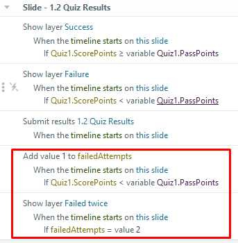 On the base layer, create two triggers: one to increment the "failedAttempts" variable by 1 each time the user fails, and the other to show the "Failed twice" layer when the "failedAttempts" variable reaches 2.Result: