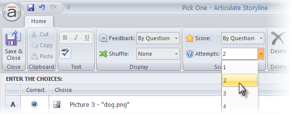 By default, Storyline gives learners one attempt at your question. But if they answer incorrectly, you can give them the opportunity to retry. Use the Attempts selector to choose the number of attempts, or set it to Unlimited if you want learners to keep trying the question till they get it right. (The Attempts selector doesn’t appear on unscored questions, since those don’t have a right or wrong answer.)