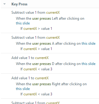 I don't see anything in the list of When User Presses a Key that only moves within the slide. The rows and columns are designated as A1, A 2, A 3 etc. Part of the issue is a particular square activates a light box so the player answers a question. Tha determines if they get a point or not.