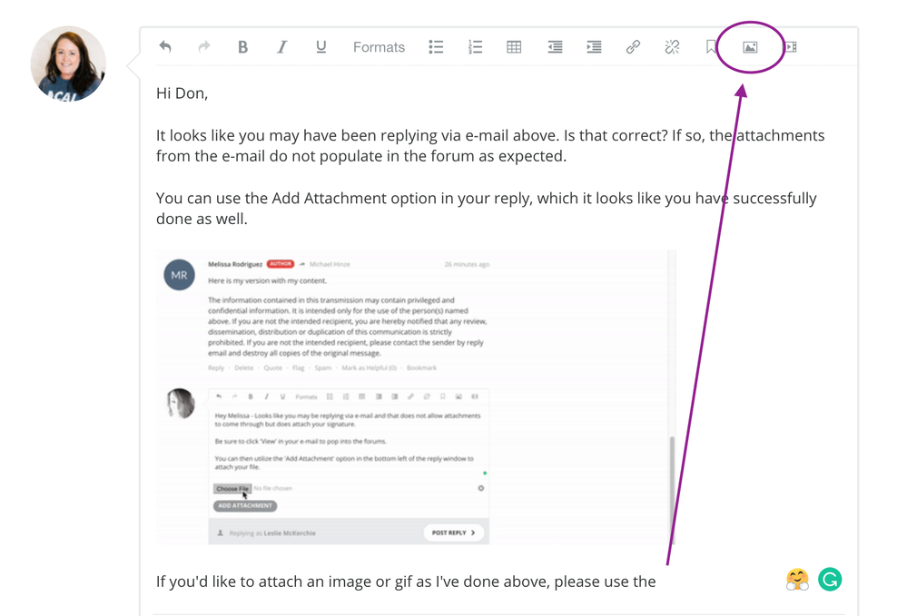 If you'd like to attach an image or gif as I've done above, please use the 'Insert an Image' option in the top of the reply window: