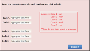 //Here we check all entrieslet code1Correct = code1 == "sun" ? true : false;let code2Correct = code2 == "mon" ? true : false;let code3Correct = inputArr.includes("tue");let code4Correct = inputArr.includes("wed");let code5Correct = inputArr.includes("thu");