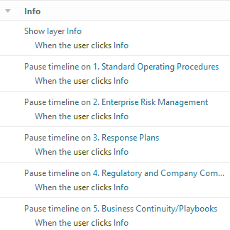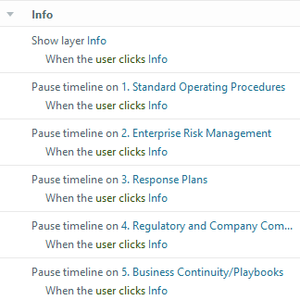 I am only guessing as I don't see any other details of your slide configuration. I don't see any impact the Pause timeline on other layers will have clicking the Info icon. As soon as you jump to Info layer, clicking the Info icon would only pause the timeline on the Info layer. The Button 1 layer should always play audio when you jump to it by clicking the Info icon. You may not hear the audio on the Info layer when the timeline ends on this layer. However, you can reset it to the initial state to ensure the audio is played again when you come back to it. Perhaps you should upload your slide (after removing any sensitive information) so we can check for other factors that might be preventing you from setting this slide the way you want.