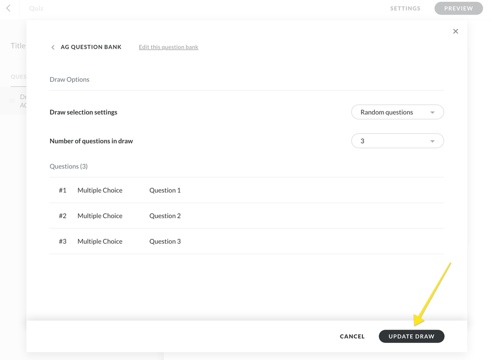 If the source question bank is modified, those changes aren't reflected until you edit the draw. Click Edit, then click Update Draw, and the images that you added to the questions in the bank should appear.