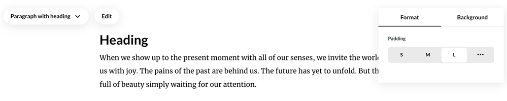 Similar to the previous format tab, the new format tab has options such as padding and color selection for block items, such as button colors. But now, instead of having to guess how many pixels you need between blocks, you can quickly apply small, medium, or large padding options. If you speak pixels, that's cool, too. You can still dial in exact pixel-widths by clicking the more icon.