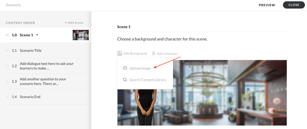 You can upload your own background image in a Scenario block by clicking Edit Background > Upload Image.