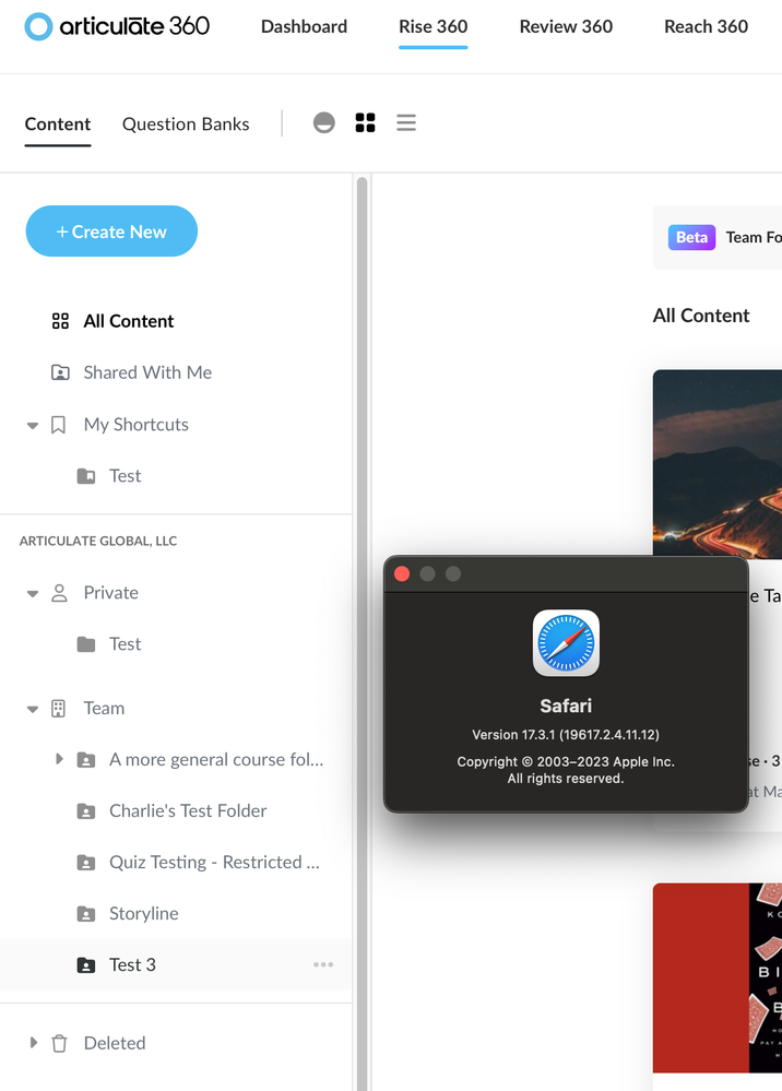 I can confirm that Team Folders display properly in Safari. Here's a screenshot of what I see on my end when I access Rise 360's dashboard using Safari: