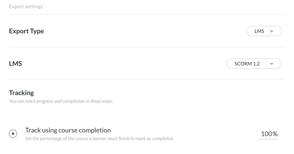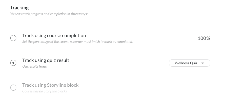 This feature lets you customize how your Rise courses track completion in a learning management system (LMS). Now you can choose to track the completion of your Rise course in an LMS based on a trigger, quiz result, or number of slides viewed in your Storyline block.