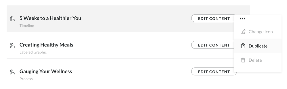 You can copy lessons within a course by clicking the ellipses next to Edit Content, then select Duplicate.