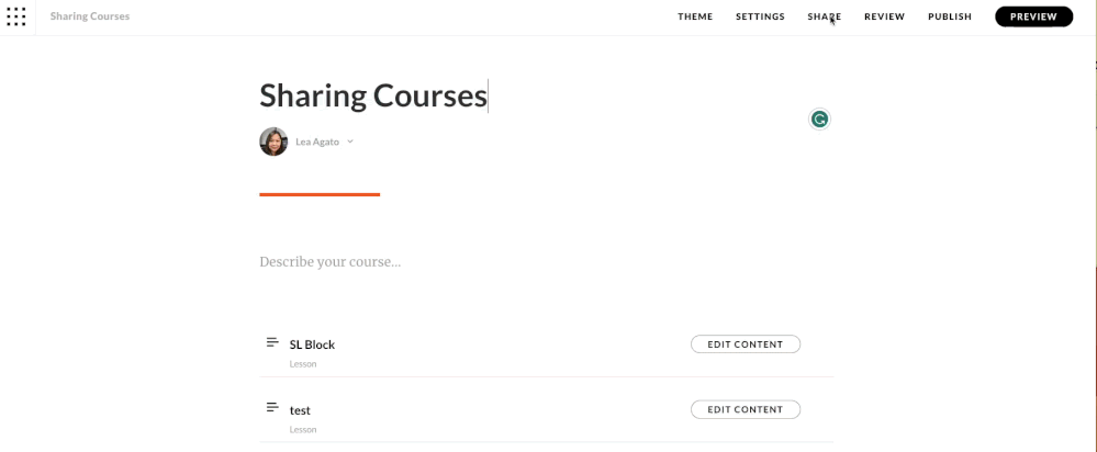 Keep in mind that both parties will have an independent copy of the same project. Changes you make to the course won't appear in the other author's version, and vice versa. Soon we will be releasing the Collaborators feature which will allow multiple authors to work on the same course.