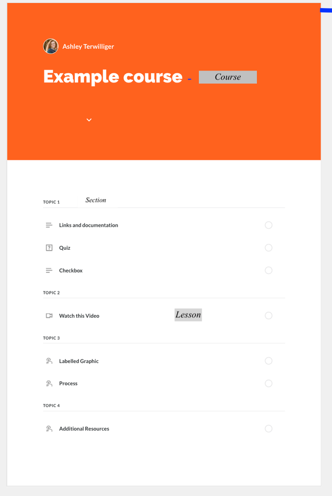 Typically we refer to the entire item created as a Course (Example Course) and within that, you can have Sections (TOPIC 1) which are like headers/dividers that can break up your Lessons (Watch this Video).