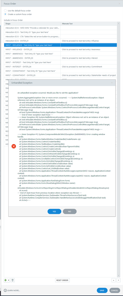 Anyway, thanks for looking. Here's an interesting screengrab I just received from my file when I tried to copy text from a word document into the Alternative Text field within the Focus Order panel.