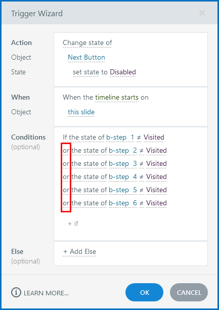 For example, if the interaction is done when a set of buttons = Visited, the disable-Next trigger would look something like this: