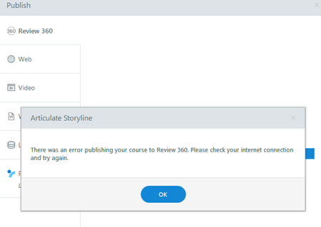 No Internet Connection Error when publishing from Storyline to Review 360