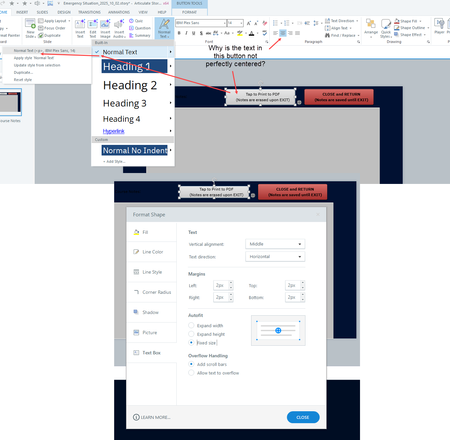 Why is the centered text in the button not perfectly centered. There are no hidden, same color bullets, there are no indents, the text box border is set to "2" for every side. The button shape is...