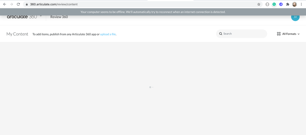 My internet connection is stable, so that's not what's going on. I can access other sites without issue, and Rise Articulate also works fine. I've tried logging out and back in, but the error message remains.