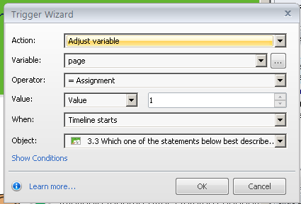 Now on the very first quiz question (this is the one that sits outside of the question banks) add a slide trigger that sets the value of the variable Page to 1 as follows: