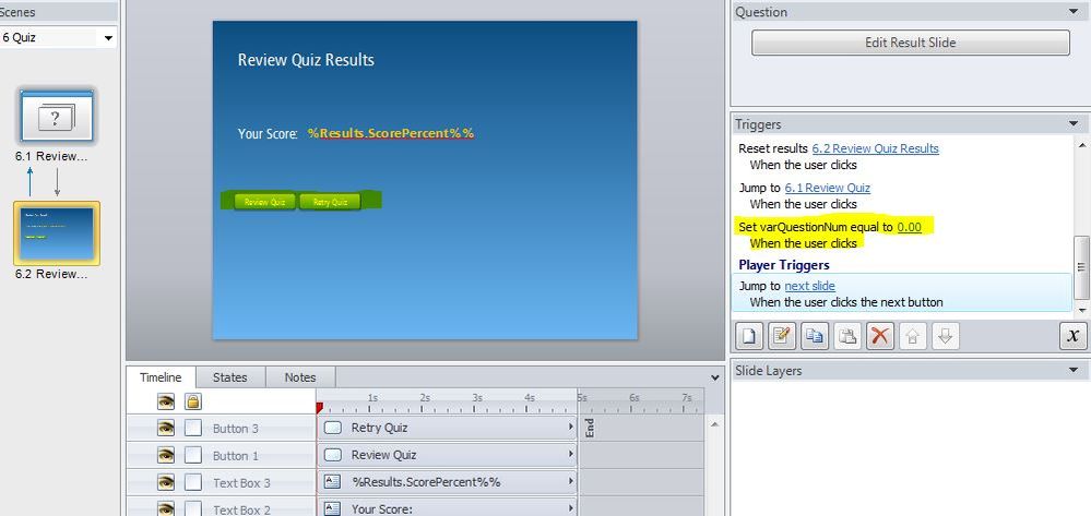 - There is a trigger to reset the QuestNumber variable to 0 when users click Retake Quiz after failing