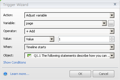 On the rest of the quiz slides, add a trigger that increments the Page variable by 1 as follows: