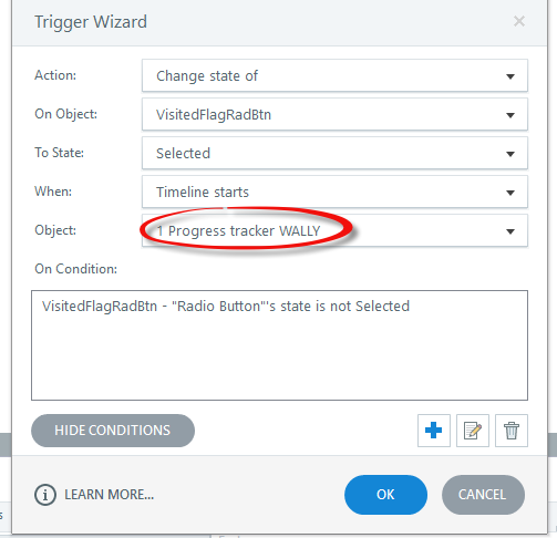 Hi! I'm trying to achieve a similar effect, but it's not functioning as I anticipate it should. I have a trigger set on my slide to add a count when the timeline starts if a variable is false. When the learner clicks an object on the slide, it's set to change the variable to true before it advances to the next slide. However, when the learner revisits the slide, it's still adding a count. I'm not sure what I'm doing wrong. I've tried setting the slide to reset to initial state and resume saved state in case that was the issue, but it adds a count again regardless. I've included a screenshot of my trigger panel. Any assistance anyone can offer will be much appreciated!